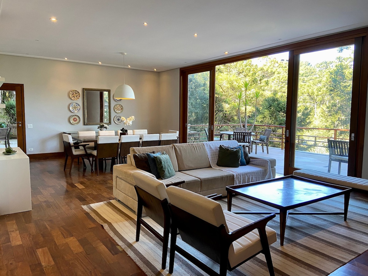 Wonderful high-end house in a prime area of Alto do Capivari. Inspired by the Tuscan fields, the house is set on a 5,000m2 plot, at the foot of a stream and with an incredible view of a valley of exuberant nature. It has 24-hour security at the condominium. Comfort, exclusivity and privacy! Jacuzzi, sauna, fireplaces, playground, central heating, pizza oven and wood-burning stove, barbecue, Wi-Fi, elliptical, hammock on the terrace and beautiful gardens will make your rest a dream!