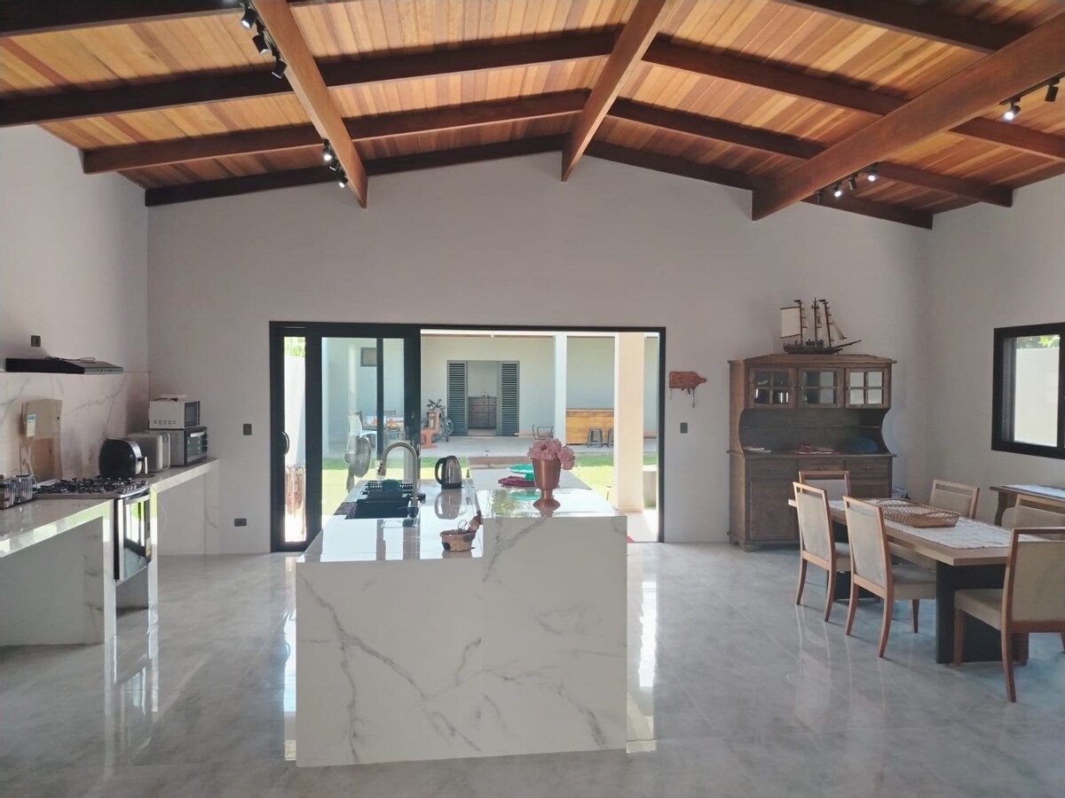 Rustic-style house, ideal for hosting the whole family, including children and pets. Or to accommodate that group of friends on an unforgettable trip! Airy and well-lit house, high ceiling, 3 bedrooms with powerful ceiling fans, one of which is a suite with air conditioning. Home office table, Wi-Fi, TV with Netflix, Disney and Spotify. Covered garage for 2 cars. Portable barbecue. Children's room with toys and games. Wooded backyard. Balcony with hammock and armchairs.