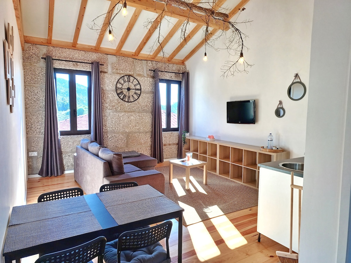 Refúgio das Poldras is located in Vilar de Viando, right on the banks of the Cabril River, one of the cleanest rivers in the region. Excellent for bathing, swimming, or simply walking along more than 2 km of the Cabril River. It is located about 2 km from the center of the village if you want to walk along the Roman road. The bungalow features a double bed with a unique view of the river, a kitchenette for light meals, a bathroom with shower, and a suspended deck.