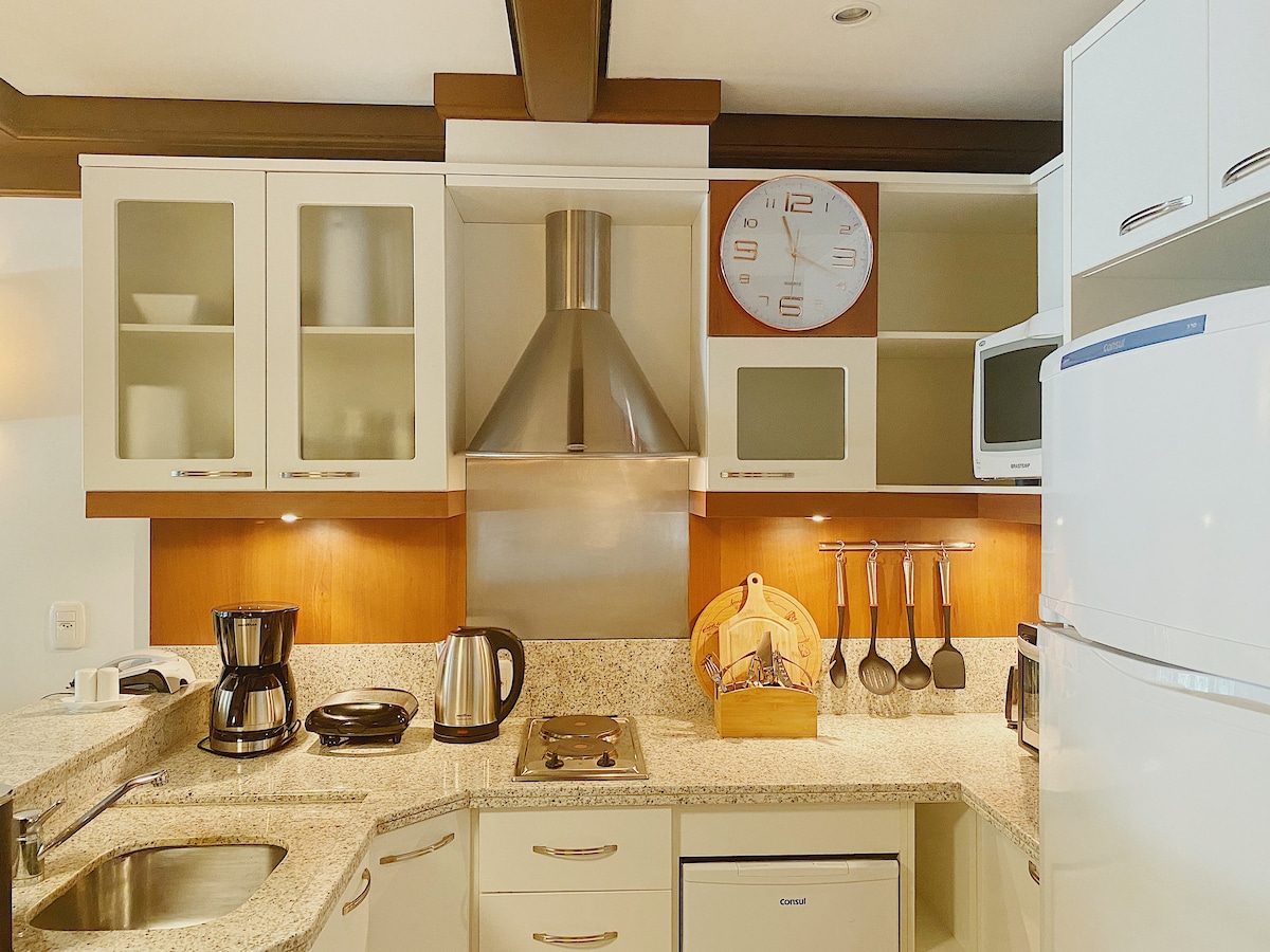 Flat located inside the Sky Borges Hotel with all the infrastructure: parking, indoor pool, sauna, Jacuzzi, kids space, fitness room, maid service with change of bed linen, bath and daily cleaning of the room (maids do not wash the dishes). The Flat has split air-conditioning, cable TV, Wi-Fi and a mini-kitchen with a minibar, electric oven, cooktop, air fryer, microwave and 3 Corações capsule coffee maker