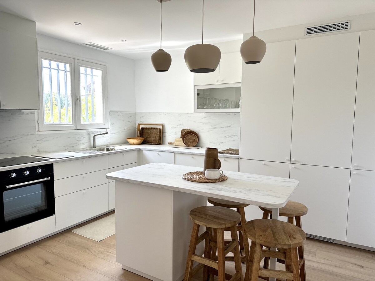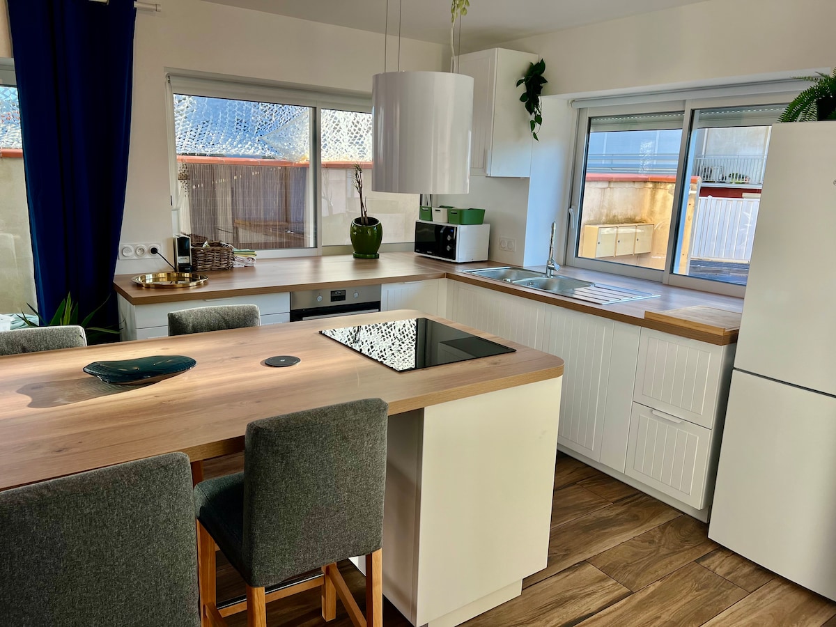 La maison se trouve à seulement 2 min à pied la plage, immense bande de sable fin de 9 km, idéale pour les balades, baignades et instants de détente face à la Méditerranée Vous allez adorer : • Grand jardin privé avec arbres fruitiers, transats, coin repas ombragé • Intérieur apaisant lumineux • Climatisation • Un niveau • Parking sur place • Animaux bienvenus • Tout à pied : plage, restos, marchés • Cuisine neuve, moderne Une maison rénovée avec soin, pensée pour notre famille