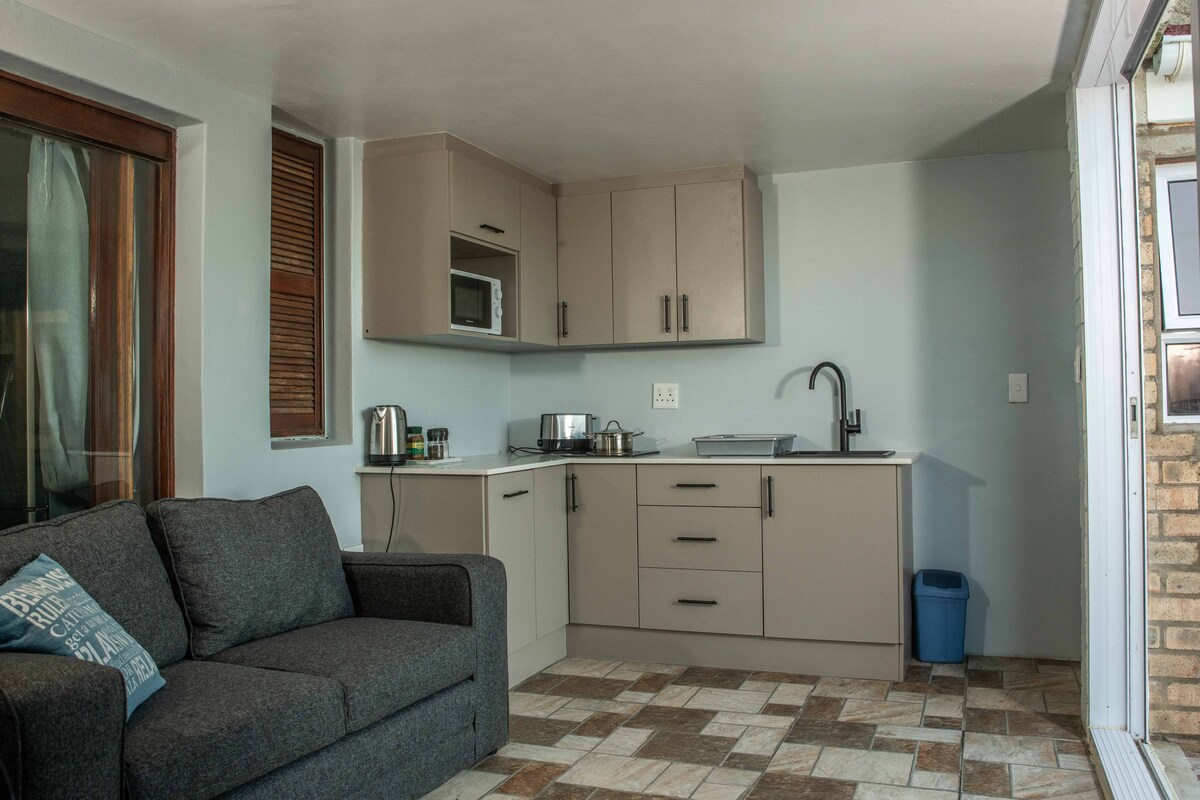 You’ll be charmed by this adorable place to stay. 1 Bedroom self-catering unit on the ground floor, within walking distance of the beach that can accommodate a family of 4, with the kids accommodated on a sleeper couch in the living area. The unit has a kitchen, one bathroom and lounge with the full DSTV bouquet and free WIFI, a pleasant patio with a gas braai. No load shedding interruptions as there is solar power. Walking distance to both the local convenient store and restaurant.