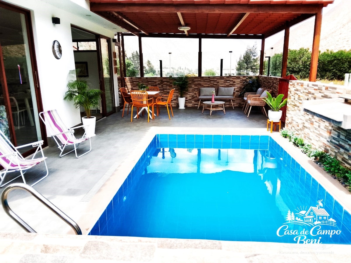 Casa de Campo Beni, en Condominio Huanchuy en Santa Rosa de Quives. Alt. Km 67 de carretera Lima-Canta. Sol todo el año. Cocina a gas equipada con menaje completo, Internet, TV, terma, 4 habitaciones con ropa de cama, 4 baños con ducha, sala, comedor, piscina temperada, terraza, ping pong, fulbito de mano, sapo, parrilla, caja china, estacionamiento para 5 autos. Condominio con piscina de adultos y niños, campos de fútbol, vóley, tenis, minigolf y zona de juegos para niños. Seguridad las 24h.