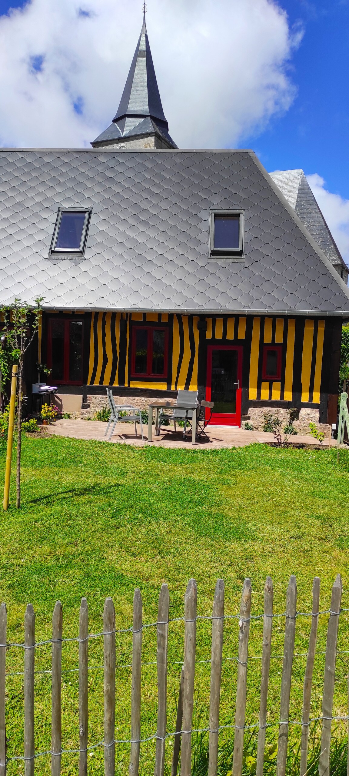 Cottage located in the deep earth of traditional Norman village . 5 Km from the beaches of Les Petites Dalles and St Pierre en Port. The Bike path is near. This is a 17th century's long house divided in 3 parts. Separation walls are heavy and the acoustic insulation is excellent. You have your own full equipped terrace , and the bakery is just in front.