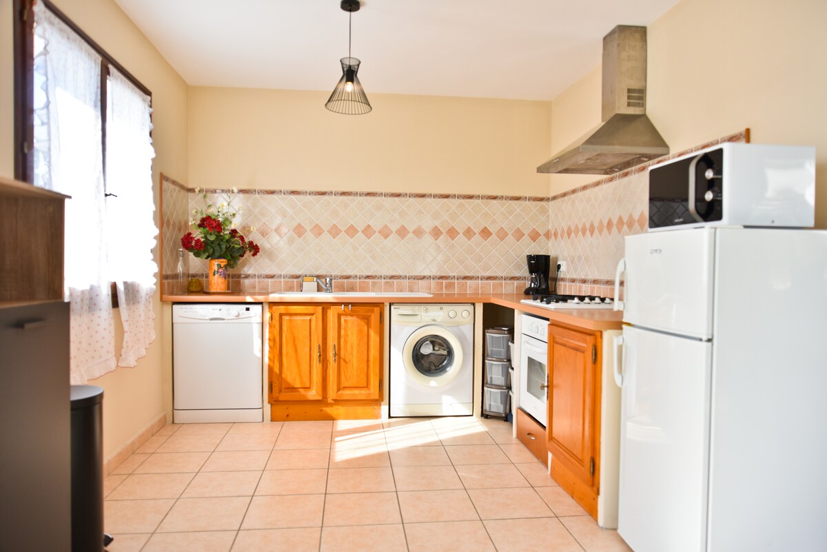 2 pièces de 50 m2 de plein pied au calme comprenant une chambre avec un lit double, salon avec canapé convertible, salle de douche, cuisine et terrasse. À 5 minutes à pied de la plage et à 1 km de la rivière. Vous pourrez également visiter un ancien moulin à huile et pratiquer des randonnées.