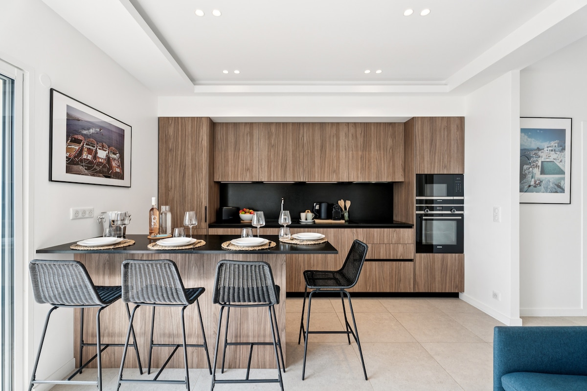 Ideally located on the first floor with a full view of the sea and Cap d'Antibes, come and enjoy our bright and elegant accommodation with high-end services and amenities. Air-conditioned, perfectly equipped and very comfortable, you will enjoy our apartment with its exterior on the sea side and a large terrace on the courtyard side. Close to the sandy beaches of Antibes, our accommodation will bring you tranquility and well-being with its large living room and kitchen open to a wide sea view.