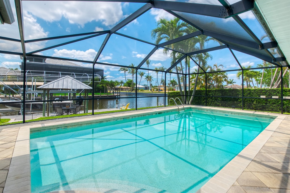 Sea You at the Cape, the perfectly located SW Florida getaway. Enjoy this stunning home on a wide canal. Watch the boats go by from your saltwater infinity edged pool, hot tub, or from the newly renovated interior. This home will help you breathe easier, laugh more, relax, and rejuvenate. Then hop on the provided kayak or bicycles to explore Cape Harbor and the many restaurants, shops, bars, and activities of Cape Coral. By boat enjoy the gulf and beaches just a mere 20 minutes away. Enjoy!