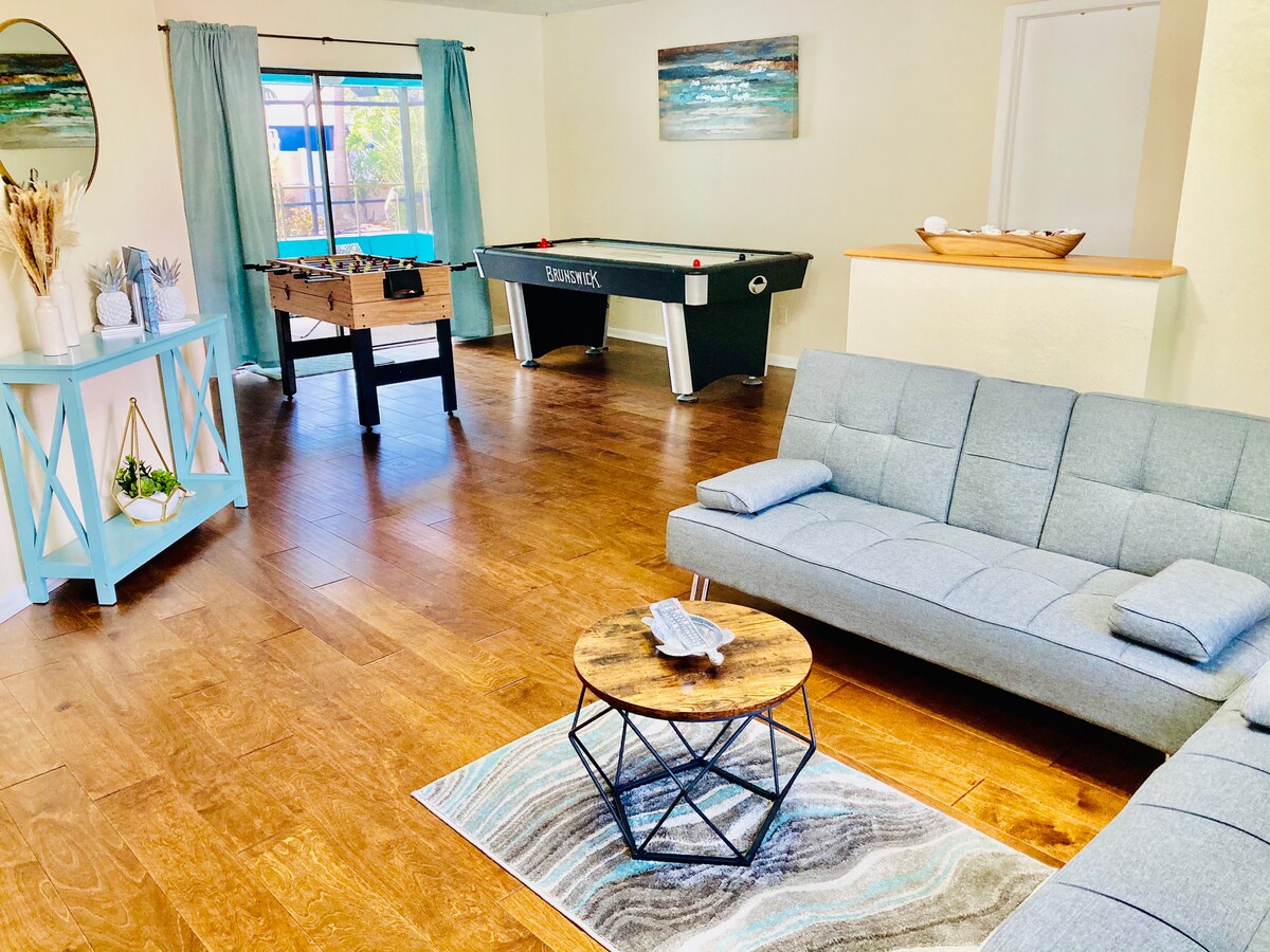 In a prime area, this luxury house is furnished and equipped with the comfort of our guests in mind. It features a pool and heated jacuzzi, views of a serene canal, and a beautiful dock where you can spend the day barbecuing or kayaking. Fishing enthusiasts can enjoy fishing as we provide fishing rods. The house has a large game room where you will find all kinds of entertainment for all ages. This is the perfect place for families, friends and groups seeking for adventure and relaxation.