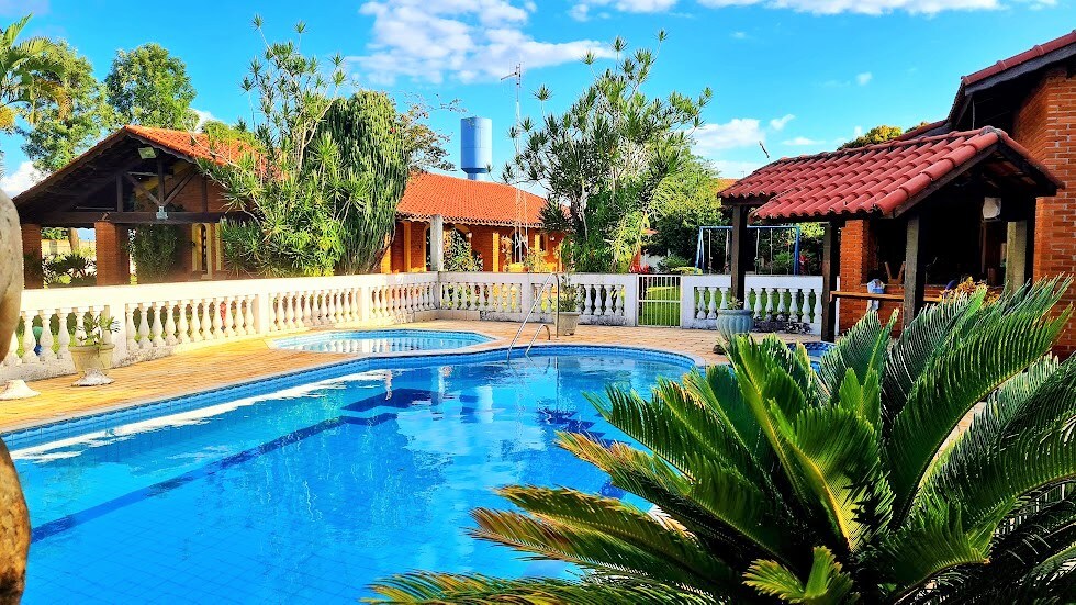 The property covers 5,000 sqm, with a pool near the barbecue area, sports court, and a complete game room (billiards, foosball, table tennis, video games, and card table). It offers mesh Wi-Fi with 600 Mbps fiber internet, satellite TV, a single-floor layout, flat terrain, a kid's playground, and numerous communal spaces, both indoors and outdoors! Located just 1 hour from São Paulo! The house is a mere 10-minute drive from the city center and the Skydiving and Ballooning Center.