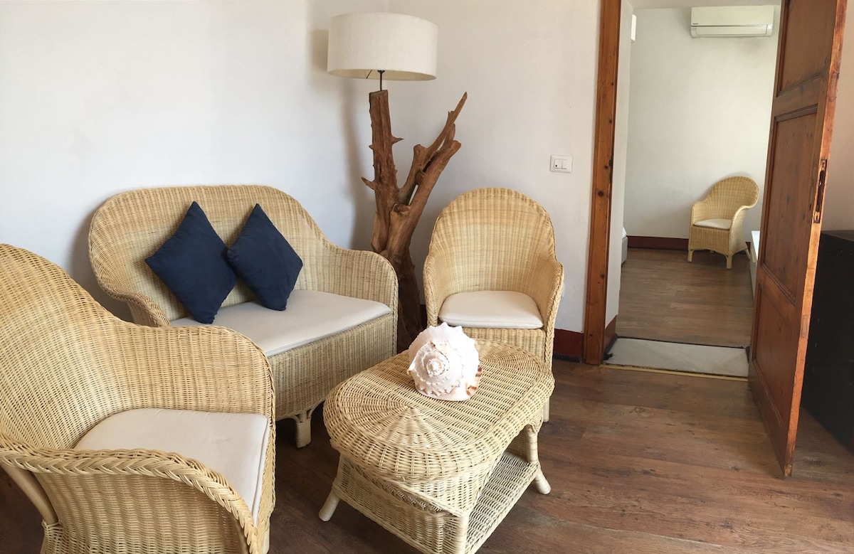 Delizioso appartamento arredato con cura, in stile etnico, provvisto di ogni comfort, in un casolare appena ristrutturato secondo i principi della bioedilizia, immerso nella macchia mediterranea del più bel versante dell'isola d'Elba, con vista mozzafiato sull'arcipelago toscano e sulla Corsica, a 250 m sul livello del mare, dominante la spiaggia di Cavoli. L'appartamento è composto di soggiorno con angolo cottura e divano-letto per due persone, camera matrimoniale e bagno con doccia e ampio spazio esterno attrezzato per pranzare e prendere il sole. Il luogo è raggiungibile con una strada sterrata di 2,5 km dal paesino di San Piero in Campo (fin dove arrivano i mezzi pubblici), distante pochi minuti di macchina dalle spiagge più incantevoli dell'isola (Cavoli, Seccheto, Fetovaia) e dal centro turistico e commerciale di Marina di Campo. E' consigliabile disporre di un mezzo proprio. La casa è immersa nella tipica macchia mediterranea alternata a grandi e suggestive scogliere di granito. Il grande giardino è recintato, contiene un orto e un uliveto. Non vi sono altre abitazioni nei dintorni. Intorno alla località si snodano i più suggestivi sentieri per gli amanti del trekking e della mountain bike. Ideale per chi è in cerca di silenzio, relax, aria pura, e ama la natura e i luoghi un pò speciali. I padroni di casa potranno aiutarvi per ogni evenienza e perplessità. BREATHTAKING VIEW ON THE ARCHIPELAGO Charming apartment,furnished in ethnic style,with every comfort,in an old cottage just renovated according to the bioarchitecture,amidst the Mediterranean bush in the most beautiful part of Elba island with breathtaking views on the Tuscan archipelago and (email hidden) a.s.l.,overlooking famous Cavoli beach. The apartment has a living room with kitchenette and divan bed for two persons,a double bedroom and a bathroom with shower and a large outside patio for eating and sunbathing. You can reach the place through a 2,5 Km dirt road from San Piero in Campo,where pubblic transport ends,and from where ,in few minutes by car you can get to the best beaches of the island (Cavoli,Seccheto,Fetovaia etc.),and to the touristic and service centre of Marina di Campo. It's better to have your own car or motorbike(you can rent it anywhere on the island). The house is surrounded by the typical mediterranean bush scattered with huge granite cliffs. The large garden has an olive grove and a vegetable garden. The place is secluded and there are no other houses in the surroundings. It's an ideal place for trekking and mountain biking and lovers of relax,peace,nature and special places. Your host are ready to help for any need and request.