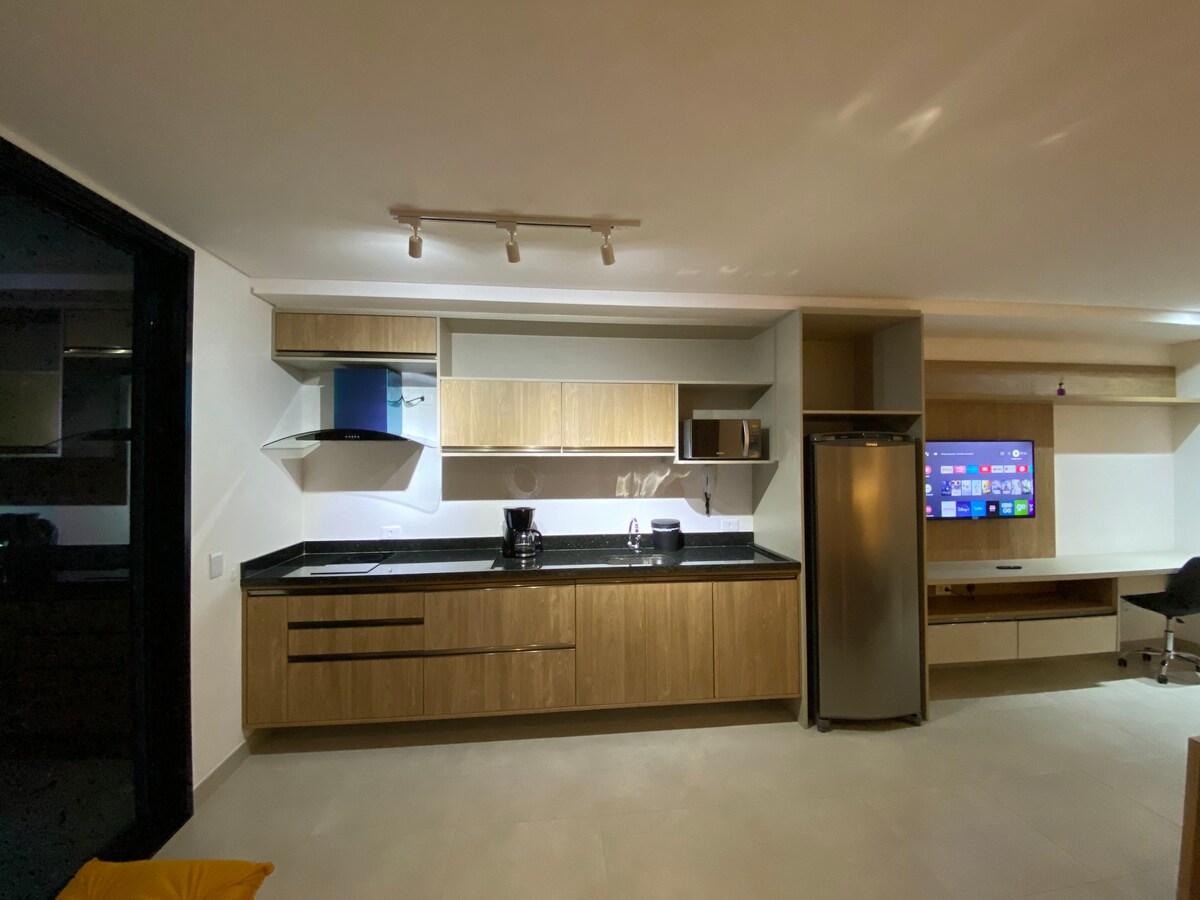Studio 409 is simply charming. It's on the fourth floor. With pink tones, creating a romantic and delicate atmosphere. Beautifully decorated, taking advantage of every space, with finely finished furniture planning. It has a privileged view, gourmet area with barbecue, full kitchen, smart TV, air conditioning, queen bed for greater comfort. The condominium has a leisure area with a swimming pool on the 5th floor. We have parking. ATTENTION: WE DO NOT PROVIDE SHEETS AND TOWELS
