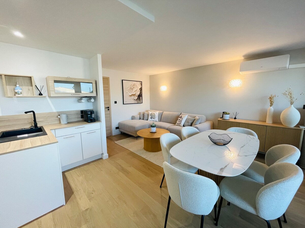 28 m² duplex apartment that can accommodate 4 people, ideally located a few steps from the lake and the center of Maubuisson Its covered terrace, not overlooked, with forest views, will allow you to enjoy your vacation around a barbecue and plancha. Upstairs, a bright bedroom with ample storage and a mezzanine with a bunk bed for 2 children. The sofa bed (very good quality) offers another sleeping option. Important: the apartment is air-conditioned