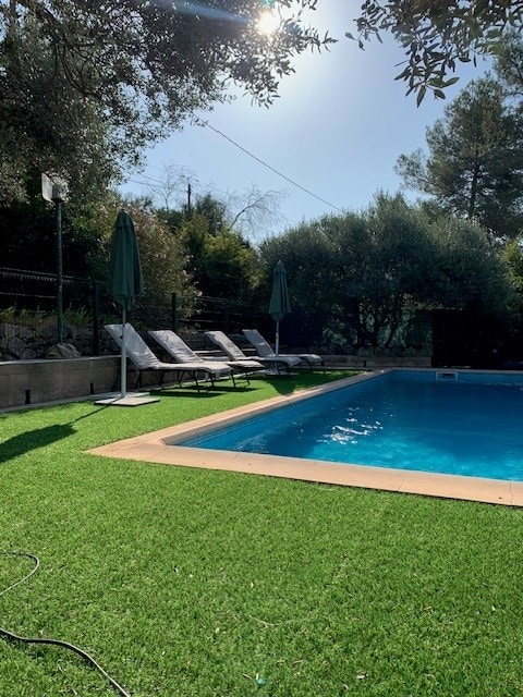 Relax in this new, quiet, functional accommodation (66 m2) in a green setting on the Lorgues hills, just 2 kilometers from the lively city center and its many shops and restaurants. Small corner of Provençal paradise surrounded by olive trees, pine trees, lavender, come and enjoy a magnificent infinity pool with its splendid unobstructed view, its terraced garden. We live upstairs but we are discreet and available to advise you if necessary.