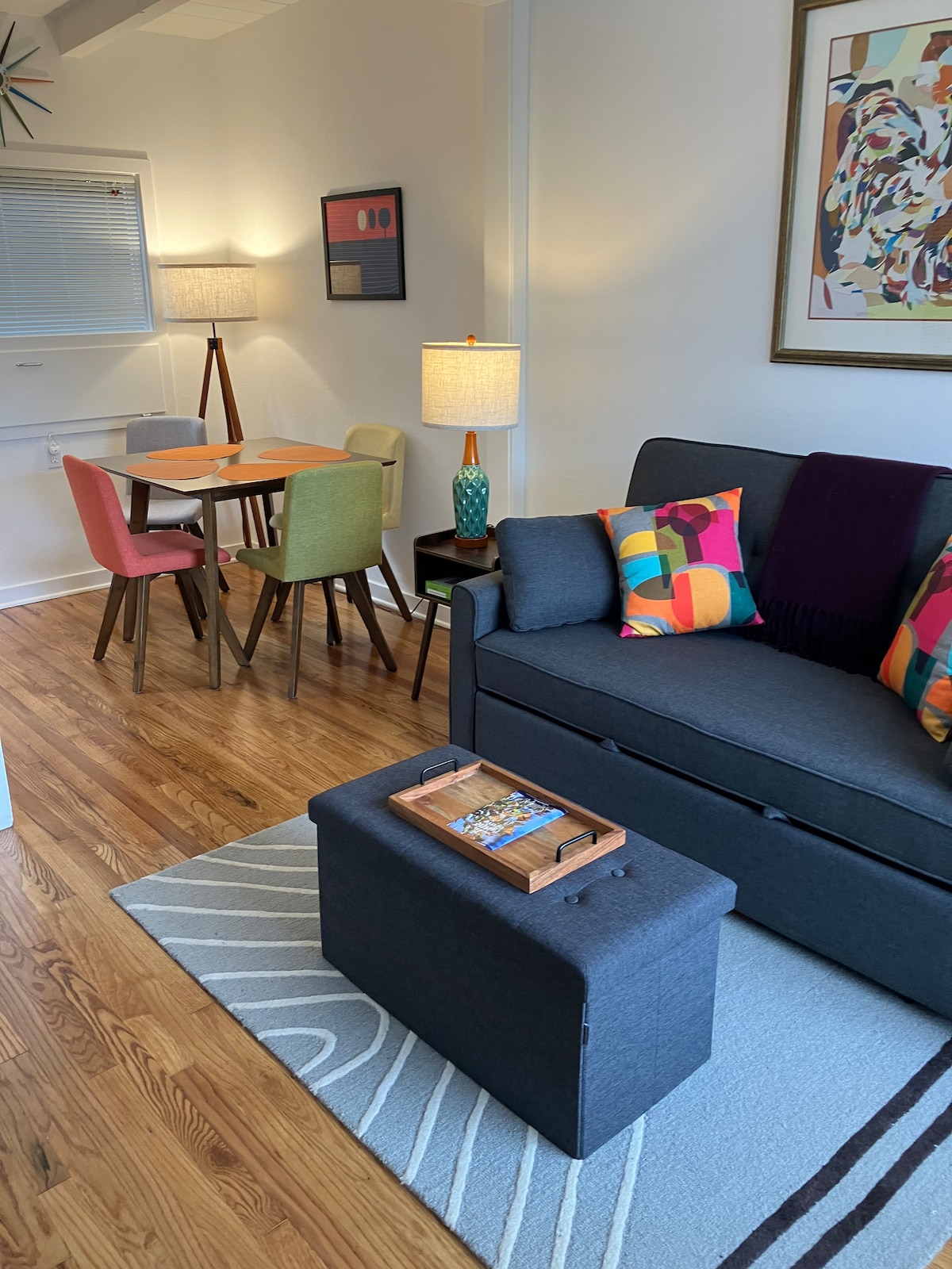 The Studio is brand new. It has a private entrance with no other apartments, hence very quiet, no one else living in the building. Situated above world famous "Anderle Gallery" An adjustable Queen bed with a remote to make softer or harder. A flat screen 4K TV at the foot of the bed, with Wifi, and access to NetFlix, Prime, etc with your password. Beautifully decorated with art objects, lamps and rugs. All new range, fridge, coffee maker, toaster, microwave, and iron/board.
