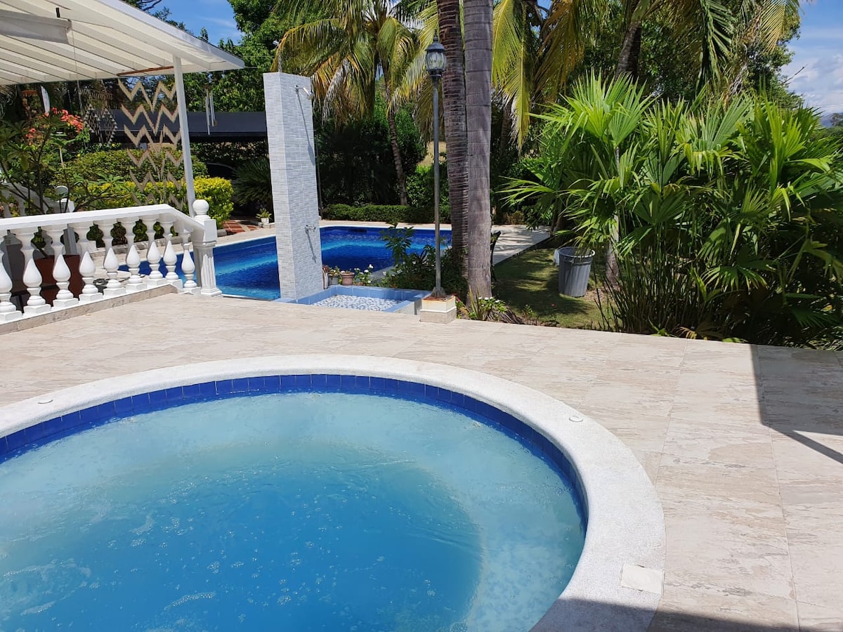 A totally private house within the Condominium El Imperio just 5 minutes from Carmen de Apicalá, has a beautiful swimming pool and a pleasant jacuzzi with BBQ area, green areas with fruit trees, has TV with DIRECTV, wifi, 4 sun chairs, 2 hammock, wet area bathroom and shower for wet area, dining and kitchen utensils, the set has 2 social venues and restaurant/cafeteria, tennis courts, multiple courts, ping pong table, billiards and surveillance 24/7