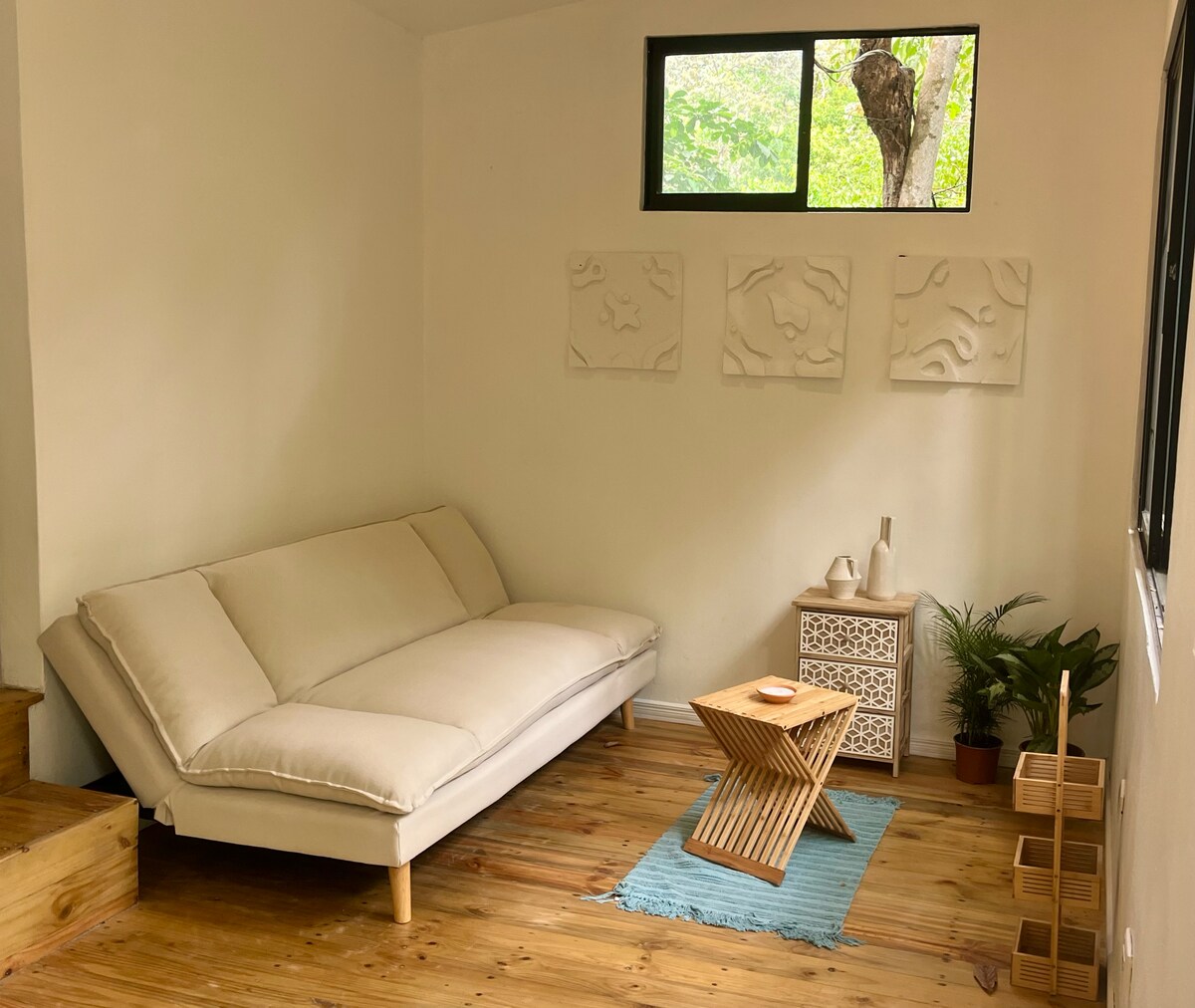 Just MINUTES’ WALK to the BEACHE of Malpais, and only 700m from Santa Teresa’s crossroad, our peaceful escape is perfectly balanced with a lively town vibe. This modern home sits in a lush retreat community with 24h security and a gorgeous shared pool near by restaurants, banks, and shops. The stylish studio features flexible sleeping, exquisite kitchen, cozy living area, and outdoor deck with a superb BBQ grill. Off the main road for peaceful quiet, warmly hosted and loved by guests.