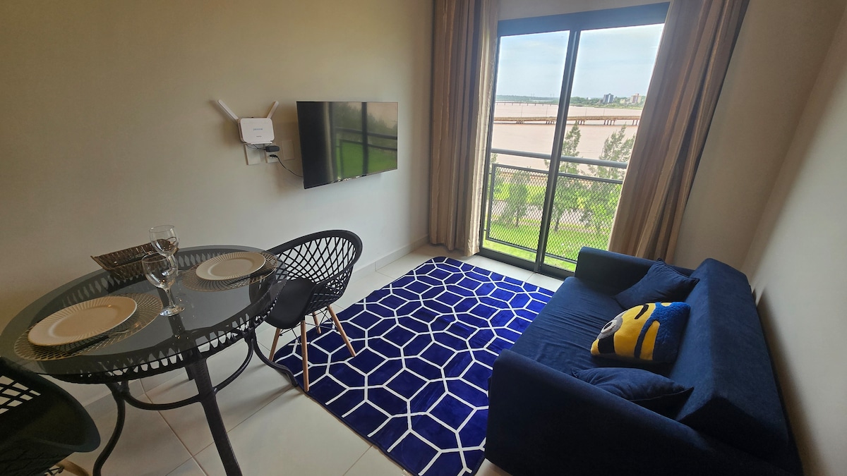 This beautiful apartment combines modernity and the natural charm of the riverside setting. It offers panoramic views of the river in all its environments, inviting you to contemplate the serenity of the water in all its splendor. Floor-to-ceiling windows flood the space with natural light. It is equipped with smart TVs, audio equipment, and top-quality appliances. The TVs feature premium Netflix, YouTube, Disney, and Max services. It has a master bathroom and a toilet.