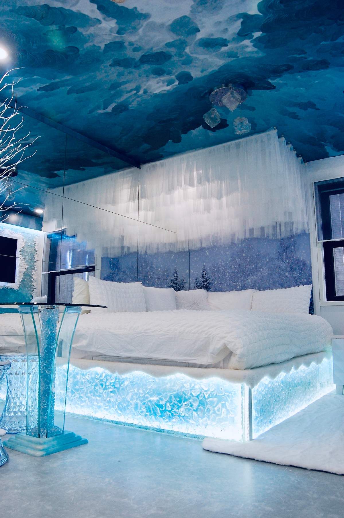 Step into a magical little world of ice and snow. Weave memories of your very own fairytale as you snuggle onto a mesmerising glowing ice bed, surrounded by a romantic scene of lights bouncing off intricate decors of ice and snow throughout the room. Fall asleep under an aurora inspired assembly of veils and twinkling lights, and when you wake up, treat yourself to the aromatic scent of tea or espresso.