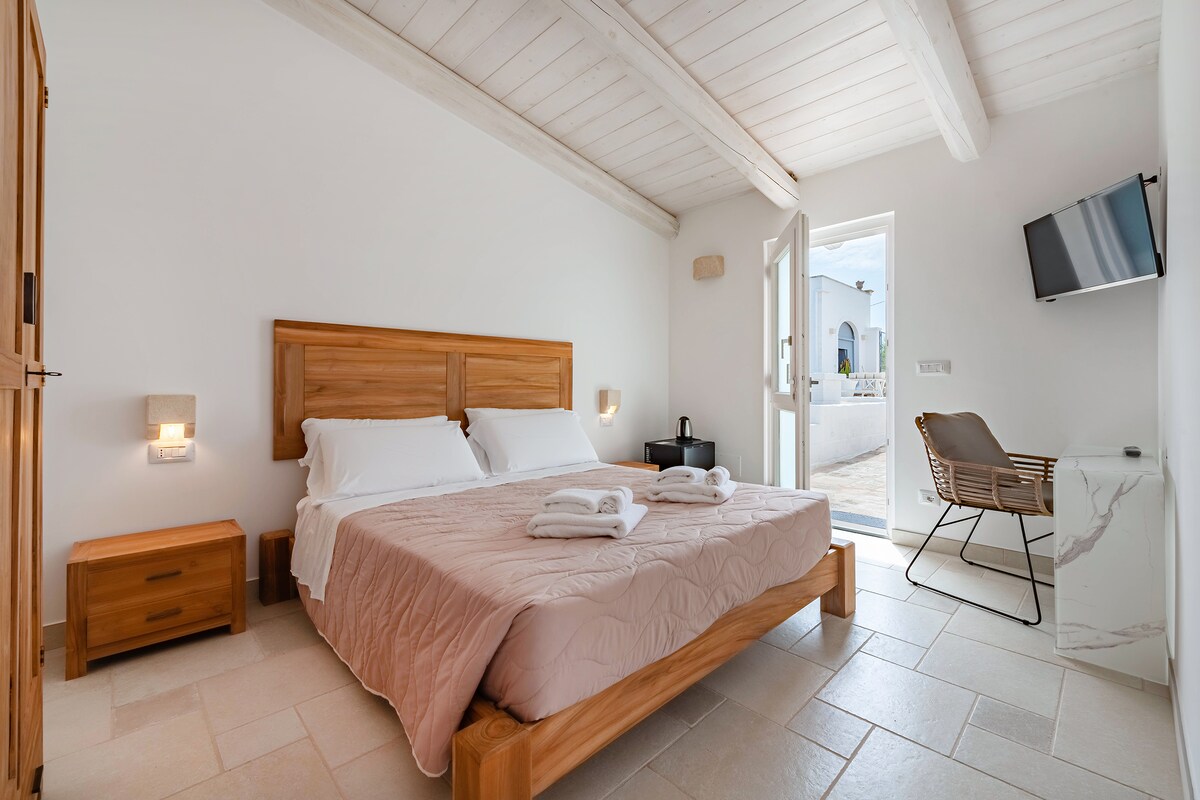 B&B in a 17th-century Masseria, surrounded by 8,500 mq of centuries-old olive groves, just 20 minutes from the beaches of Ostuni. 2 Junior Suites and 2 Suites with direct and independent access from the courtyard. Dazzling white walls, secluded courtyards, arches, stone details, and charming dry-stone walls. Breakfast with organic, locally sourced products: ancient grain bread baked, fruit from our historic orchard, and homemade cakes prepared daily by Patrizia.
