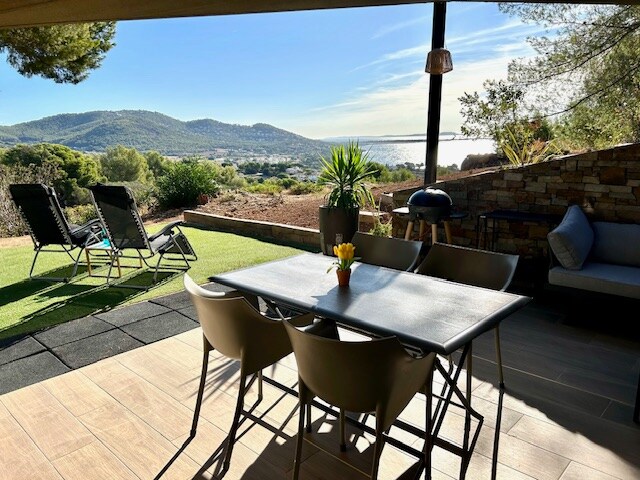 Architect's house 60 m from the sea, panoramic view of the Hyères Islands, large 70 m2 living room, open-plan kitchen, 160 m2 house, 3 bedrooms + dressing room, designer interior, nearby beaches, airport, air conditioning booking for 15 days in July August