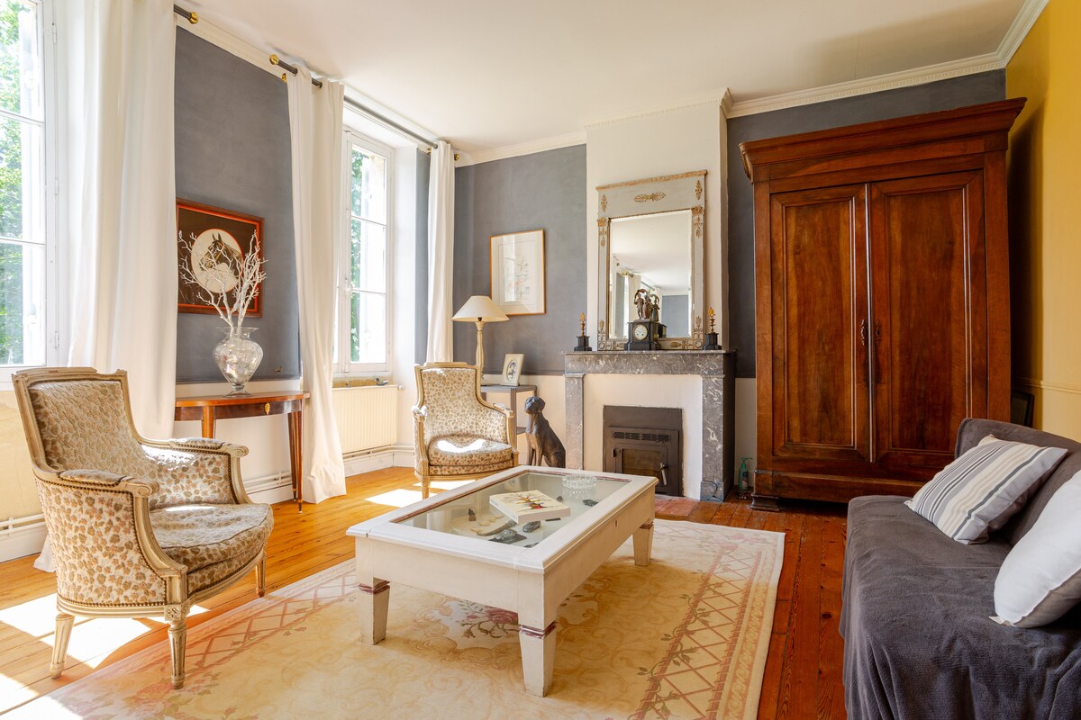 2km de Blaye, 45mn de Bordeaux, dans les vignes, calme et détente. MAISON DE FAMILLE de 400m2 pour 10 personnes + 1 bébé, réceptions en enfilade, 4 cheminées, 5 chambres dont 2 avec salon, 3 salles de bains dont 1 au Rdc, 3 WC, billard, parc clos de 4000m2, jardinet avec petite piscine hors sol. Très équipée (Thermomix, vaisselle de luxe, gel douche, shampoing, après shampoing, séchoir, lisseur, …) Au coeur d'un petit hameau, le respect de la quiétude des lieux est PRIMORDIAL