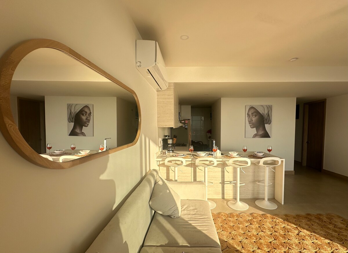 Exclusive 2 bedroom apartment with a front view of the Caribbean Sea and unparalleled sunsets. The building is located on one of the most private and spectacular beaches in Cartagena next to tropical forest trails. It has excellent social areas (Jacuzzi, Sauna, Pools, Swimming Lane, Gym), a few kilometers from the 18-hole Nicklaus Design golf course (Karibana) and just 15 minutes from Cartagena airport and 15 minutes from the Walled City.