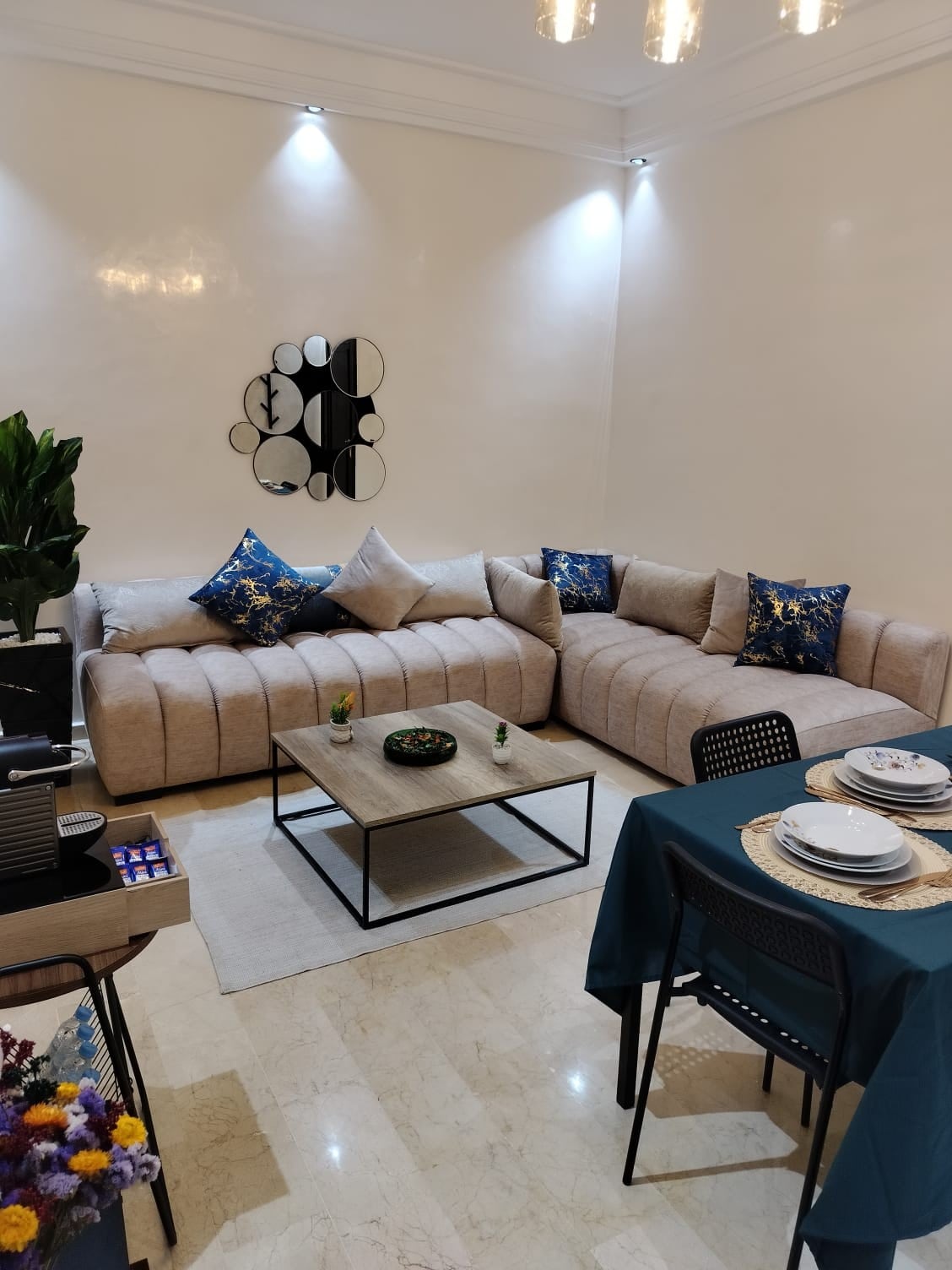 Perla 403 💎, a haven of peace where the elegance of a modern residence is combined with the comfort of 5-star hotels in the heart of Casablanca! Relax in a spacious living room with a modern design, equipped with a 55" Smart TV with Netflix and IPTV for evenings of absolute relaxation. The bedroom, a real cozy nest, promises peaceful and restful nights ☁️ From your private balcony, admire the splendid sunsets over the city, making every moment of your stay unforgettable! ✨