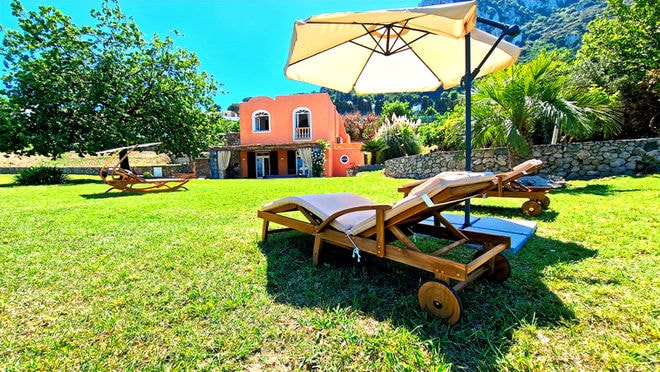 The villa is located in a quiet, private compound. Outside, on the near road there is the bus stop to reach the other villages of the island.Some of the rooms have a jacuzi, some are suitable as family rooms. Some have a sea view, some have a garden view. In Summer, guests can enjoy the private pool .The Villa has wide outdoor terraces and a lush garden with all accessorials and a gazebo covering couches.Lovable place full of natural beauties.