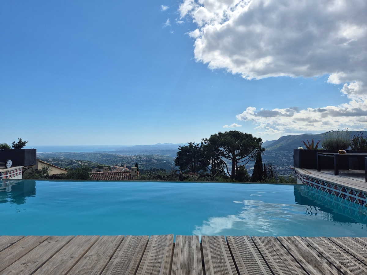 Provençal-style villa, located in a peaceful setting with views over Saint-Paul-de-Vence. Bright and welcoming living spaces provide the perfect place to gather with family or friends. The Mediterranean garden, planted with an olive tree and a parasol pine, surrounds the house and offers privacy and tranquility. The heated pool from April to October invites you to relax at any time of day, in a calm and sunny atmosphere, ideal for enjoying the Provençal way of life.