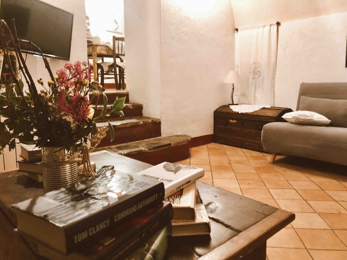 A simple and romantic space, a real room without frills with a kitchenette and a small terrace overlooking the river: from here you can see a small stone bridge... and the sound of flowing water. The accommodation is a single large vault: the whole house has been restored using natural materials, lime and paints made with flour and linseed oil. For the winter months, there is a wood stove that guests can manage independently. Wood is provided for the stay.