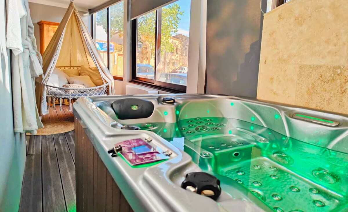 Welcome to Oraya Suite! A suite with character, designed as an intimate and refined setting, to offer you an atmosphere that is luxurious, modern and enveloping. Sit back and enjoy an immersive cinema space, perfect for your movie and series evenings. Sound, image, cosy atmosphere: everything is there to experience cinema... but better! Every detail has been designed to offer a unique experience for a timeless stay. ✨️Book and enjoy✨️