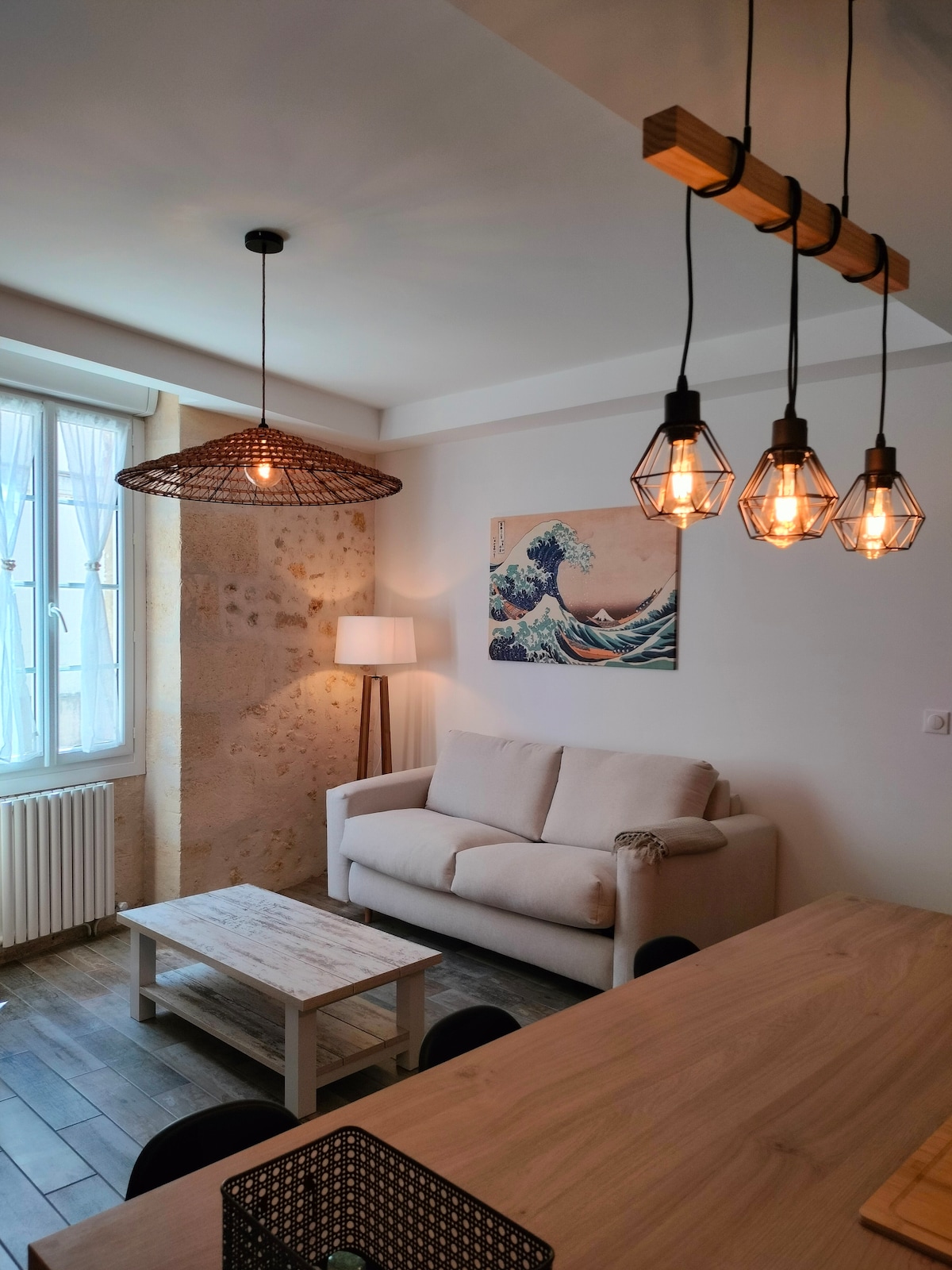 In the historic center of Bourg, ideally located, between Place de la Halle and the Church, you can stay in our apartment and its green patio to visit our beautiful region, make a stop in the picturesque medieval village of Bourg, taste the wines of the Côtes de Bourg and enjoy the surrounding entertainment. Recently renovated, we are committed to offering you accommodation that combines the charm of the old and modern comforts.