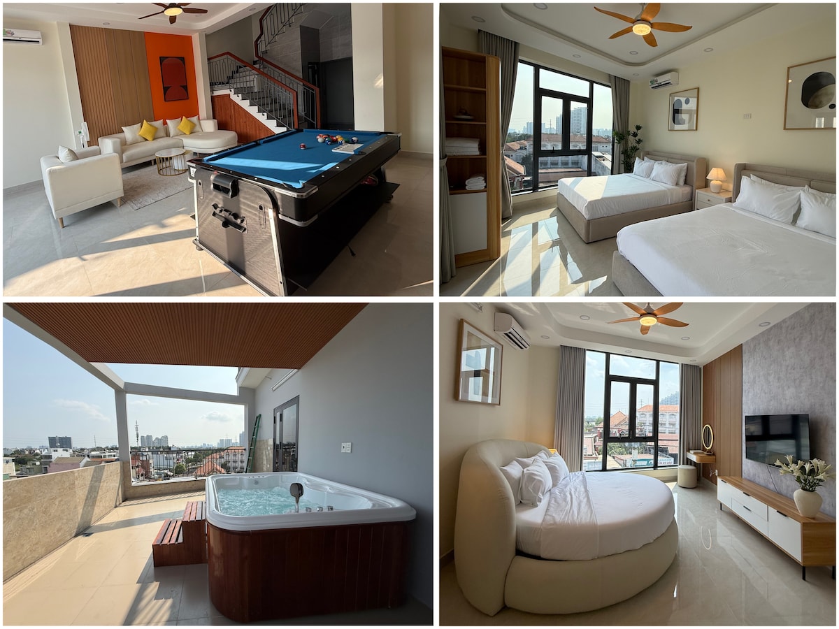 Đây là nguyên căn villa 6 phòng ngủ, chúng tôi tạo thêm bài đăng 4 phòng ngủ dành cho đoàn ít người có giá tốt hơn. (Bạn được sử dụng 4 phòng ngủ, đảm bảo riêng tư không có khách nào ở chung) Có hồ bơi riêng, bàn bida, BBQ, loa karaoke, phòng khách có máy lạnh. Nếu bạn cần sử dụng thêm phòng ngủ vui lòng liên hệ với chúng tôi