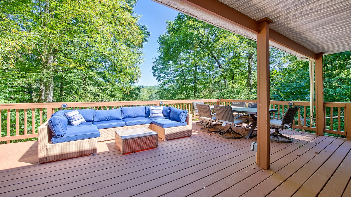Mid-century meets mountain hideaway. Panoramic mountain & golf course views give this gorgeous home a luxurious feel. This home is one mile from Maggie Valley Country Club (golf and restaurant open to public), trout streams & hiking trails. Whether you are an outdoor enthusiast looking to ski at Cataloochee, take a day trip to Asheville to enjoy breweries, Cherokee to visit the Casino or drive the Blue Ridge Parkway, this is the ultimate getaway. Sleeps 6 with over 1500 sq ft of outdoor deck!