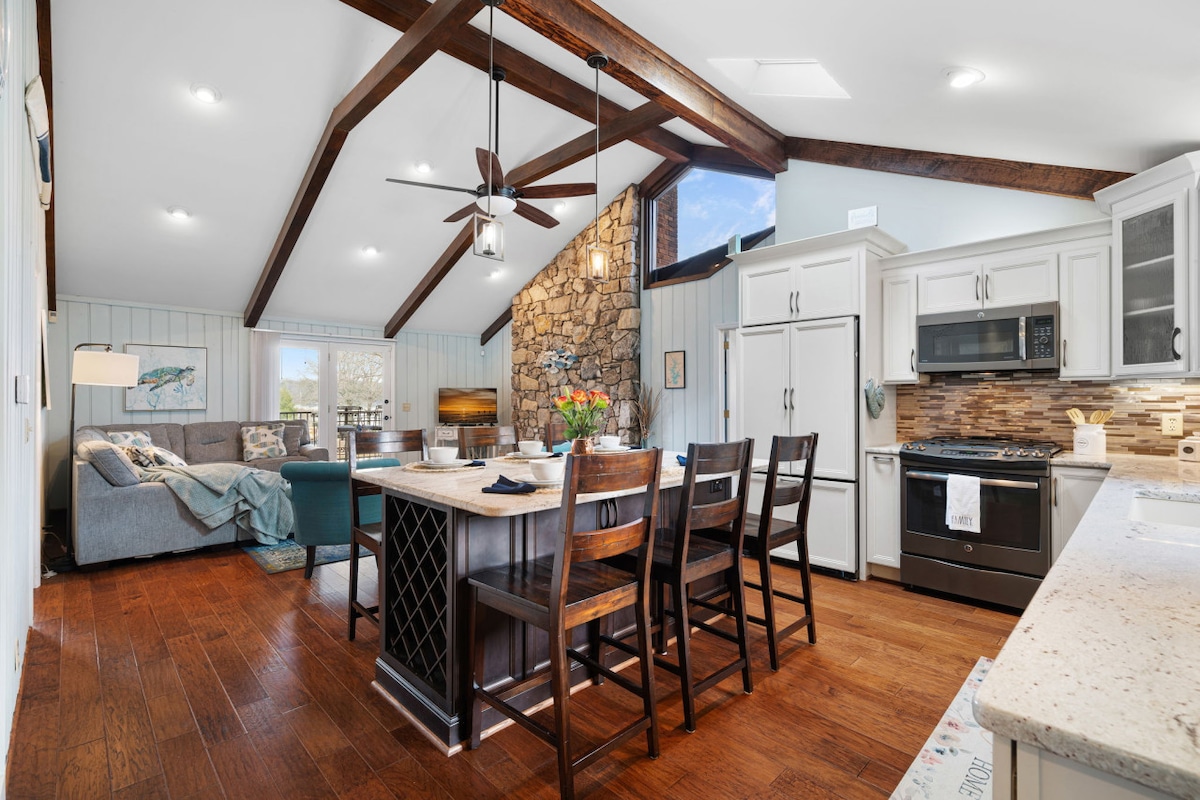 Escape to our charming 1-bedroom plus loft, 1-bath tiny home on Lake Norman. Ideal for romantic getaways, family adventures, or peaceful retreats, this cozy spot offers comfort & fun. Enjoy pickleball, swimming, fishing, free kayaks & paddle-boards just steps away. Inside, find a modern living area, fully equipped kitchen, washer/dryer, Master BR and loft- both with queen-sized beds. Relax on the private deck with lake views, or use our fitness center and arcade. Book your lakeside escape today!