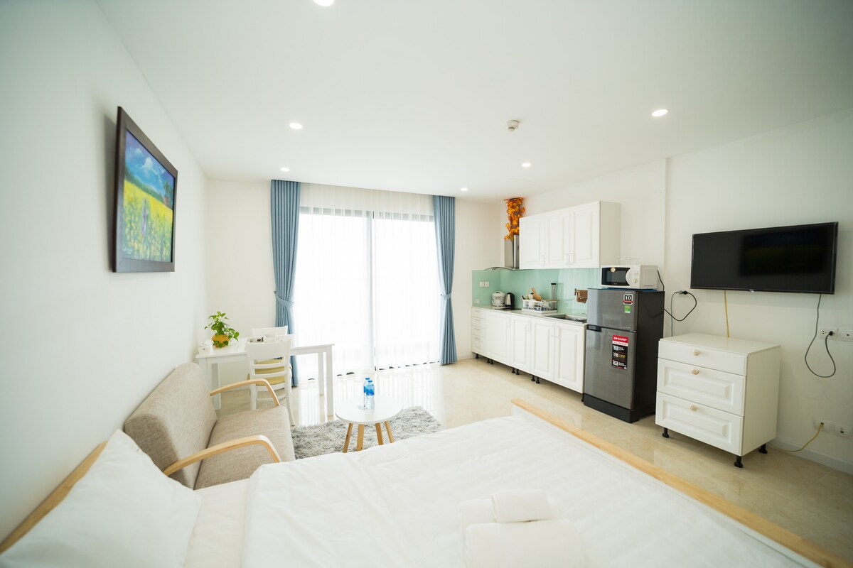 This is a spacious studio apartment located on the 22nd floor of block C2, D’Capitale Complex. With an area of 35m2, the apartment with wooden floors creates a cozy but still airy feeling with a large balcony. Beside the queen bed, the apartment has 1 bookshelf, a large sofa, and a dining table for 2 people. The kitchen is fully equipped with kitchen utensils, suitable even if you have a long stay. The apartment also has a smart SAMSUNG TV with Netflix and fast internet for remote working.