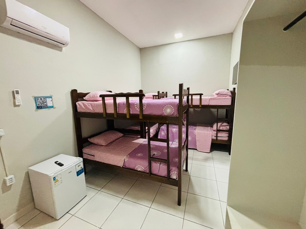 Quarto 104: Este é nosso quarto plus, é ideal para grupos ou famílias, oferecendo conforto e praticidade. Com 3 beliches, acomoda até 6 pessoas. Conta com um closet para organização, ar condicionado para conforto térmico, frigobar para bebidas e lanches, e um banheiro privativo para maior conveniência. Perfeito para quem busca um ambiente funcional e acolhedor, ideal para descanso e lazer com total privacidade e comodidade.
