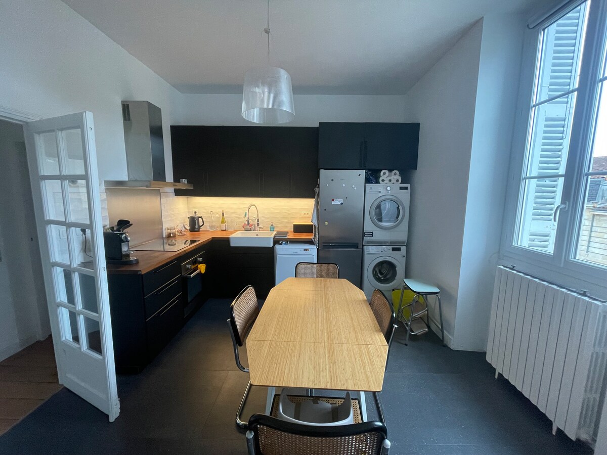 A 95 m2 duplex apartment, privileged location, in prestigious street directly overlooking the 'Jardin Public' is a cosy and chic home base. The flat on third floor, elevator, building 18th century. Downstairs living room and kitchen. Upstairs two bedrooms. Bathrooms with showers and toilet on each floor. The decoration is matching traditional Bordeaux stone walls with modern contemporary style.