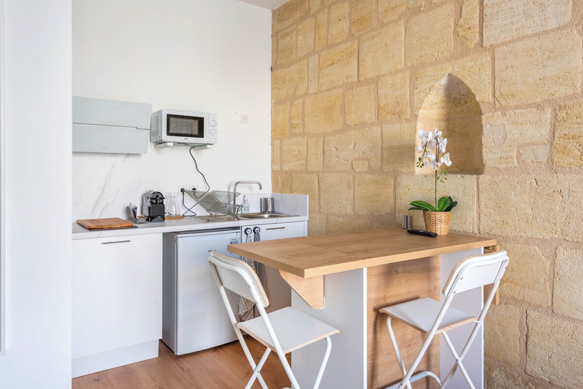 Charming attic apartment, bright and cozy, located on the 3rd and top floor without elevator access, close to all shops. It offers a living room with equipped kitchen, a bedroom with double bed, a bathroom with bathtub and a northeast-facing terrace, ideal for enjoying the morning sun. This comfortable and warm accommodation is perfect for travelers who want to enjoy a quiet location while staying close to the center of Bordeaux.