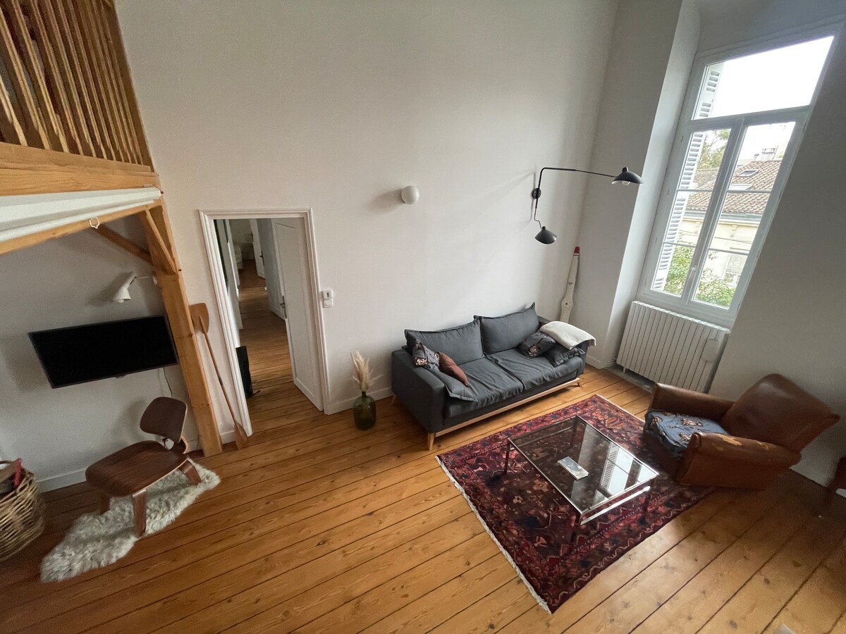 Very nice apartment completely renovated, loft style, very bright and very quiet, located in the St Michel / Capucins district. It includes two independent bedrooms, each with bathroom and toilet. Very large living room, very bright, with exceptional views of the rooftops of Bordeaux and the Saint-Michel church. Large fully-equipped kitchen. Rooftop terrace with panoramic views. More information below.