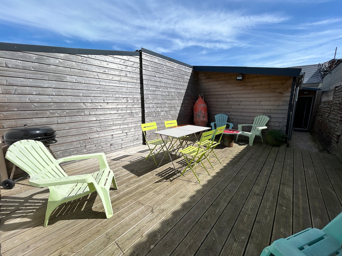 Charming house in the heart of the seaside resort of Cayeux-sur-Mer. A fully equipped kitchen, a large screen TV. 2 bedrooms with double beds including 1 king size, also available a sofa bed in the living room. Linens and towels are included in the rental. You will also have a 25 m2 terrace with sun all day where garden furniture and a barbecue await you. Ideally located, 10 minutes' walk to the sea, market and resort center.