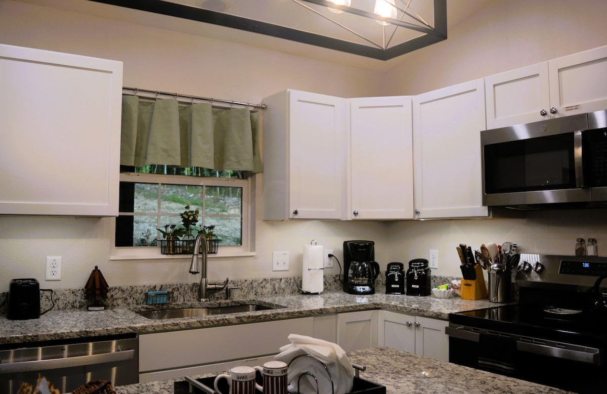 Take it easy at this unique and tranquil getaway. This one bedroom cabin overlooking a creek is minutes away from restaurants and entertainment yet secluded enough for privacy and peace. It has a full kitchen, 50 inch tv, WiFi, coffee bar, deck and much more! You now have the option as a two bedroom if you need more space check out our other listing with the original creekside log cabin! Book your stay today!