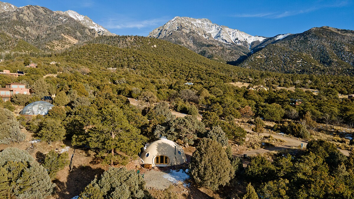 The Dome is soothing & nurturing, with spectacular mountain views and backing to greenbelt. Open living/dining area w/ loft for meditation, yoga & play. Fully equipped open-shelf kitchen with gas range & all appliances; washer/dryer; WiFi. Cozy in winter with radiant floor heat and wood stove (addon cost for use). Perfect get-away; visit sand dunes & hot springs, hike, explore, relax, and enjoy Crestone too. SEE OUR GUIDEBOOK AND REVIEWS!