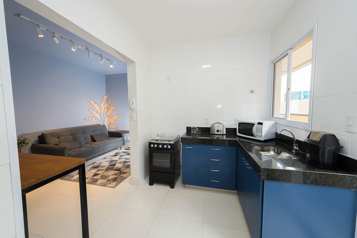 Cozy apartment with elevator. Mission: to offer the best environment at a fair and honest price. There are 2 bedrooms, 1 suite, with double bed, blackout curtain, and air conditioning - and - another bedroom with fan and double bed. Social bathroom, living room with retractable sofa and 50" smart TV, kitchen with basic items (pots, dishes, blender), 1 parking space, DOES NOT fit a pickup truck. Wi-Fi. It will be a pleasure to welcome you!