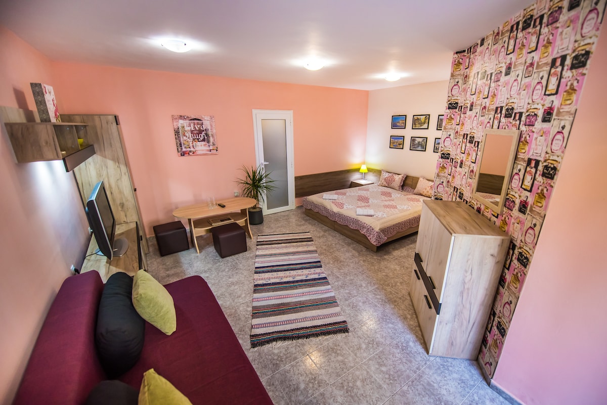 The studio room is located in the heart of the city center (only 2 minutes away). Walking distance from the main square, central railway station and bus station and also within 5 minutes reach of a shopping mall ( Mall Markovo tepe) and grocery stores. It consists of 1 master bedroom with two single beds which could be adjoined and become a queen size bed. The unit has a private entrance, own parking spot cozy garden and it is fully furnished.