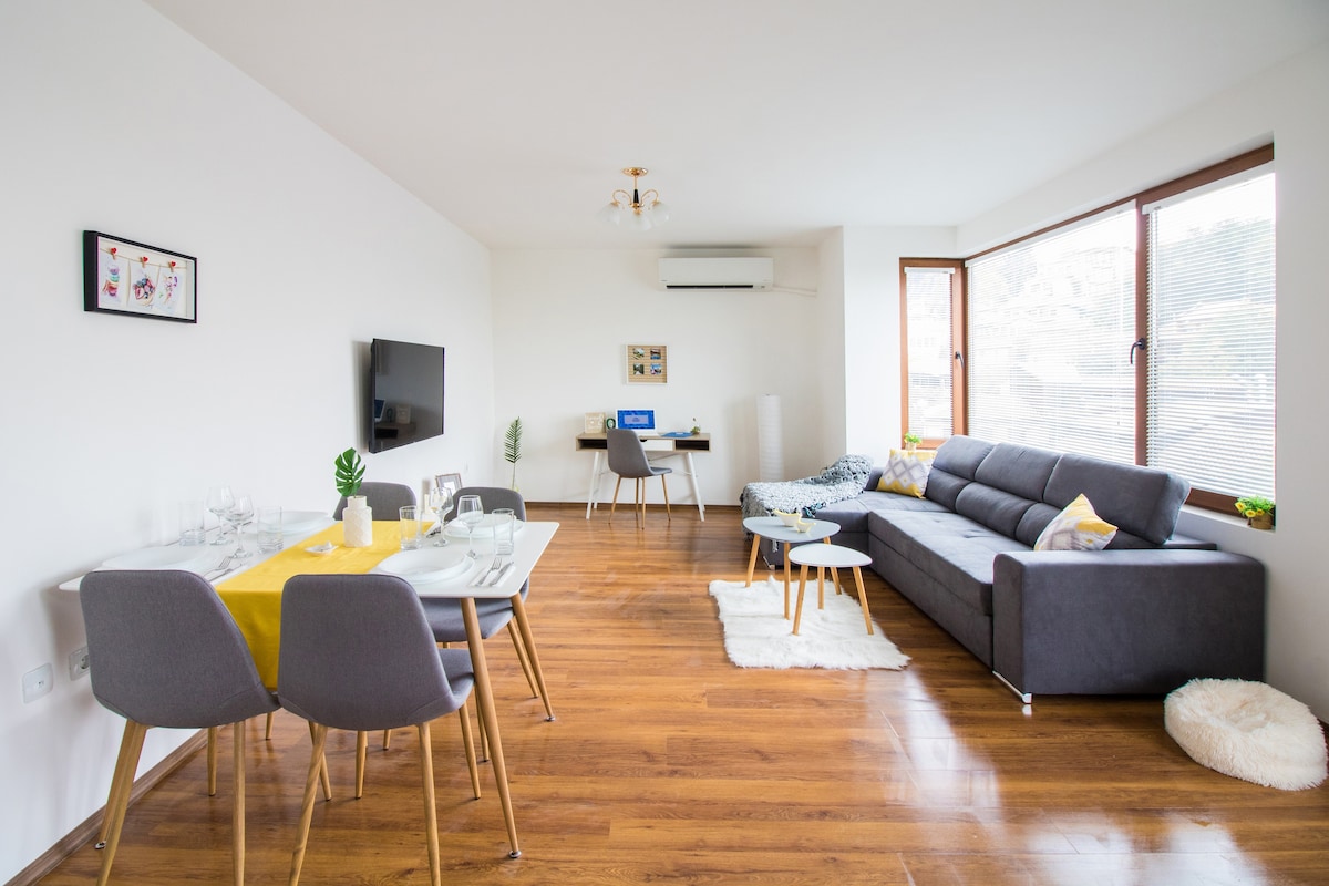 Our charming apartment is located in the heart of the city and similarly to the rhythm of the town mixes modern furnishing in a calm and relaxing atmosphere. The flat is on a 5 minutes walking distance from the main pedestrian street, the central garden and the old town. The area offers a variety of shops, markets, restaurants and bars. We aim that our guests enjoy home comfort during their stay and experience Plovdiv at its best.