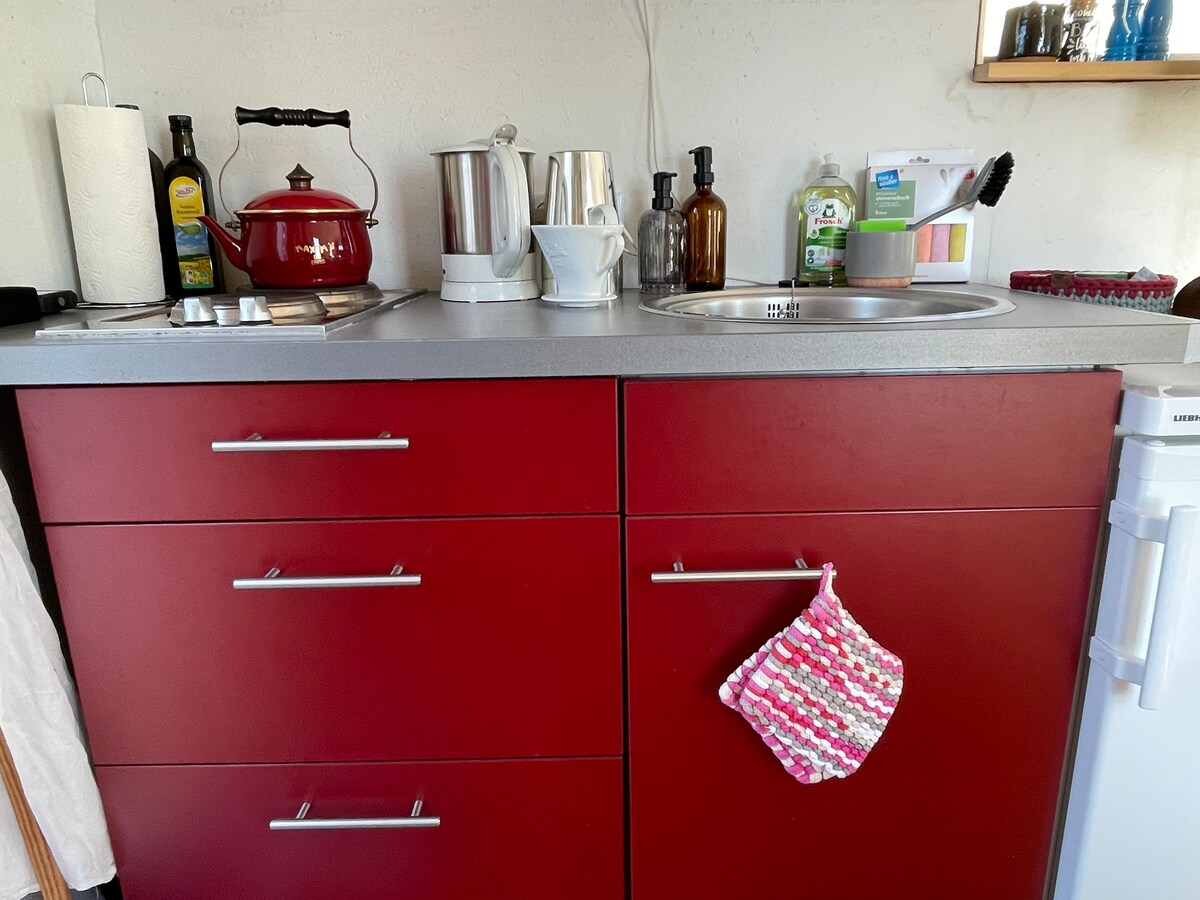 In the middle of fields and hedgerows you will find a quiet spot on the edge of the field with a wide view over the Baltic Sea. The Baltic Sea beach can be reached in 20 minutes by bicycle. A freshly converted 14 m² construction trailer with a bed (160), a small kitchenette and a seating area inside/outside awaits you. The toilet and shower are in another construction trailer next door. Fresh vegetables and eggs from our garden are available seasonally :)