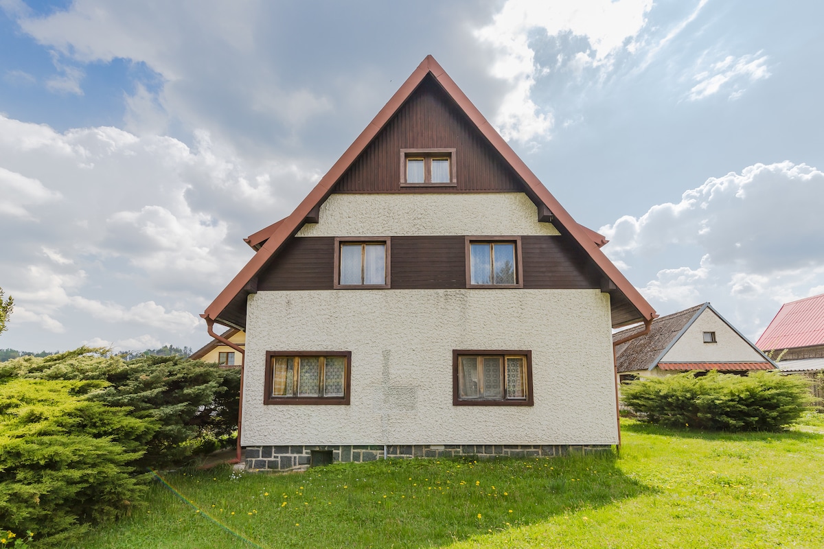 Don't have your own cottage? No problem, we will be happy to welcome you to ours in Hrabětice in the Jizera Mountains. Unfortunately, more than 8 of you will not fit in, but even that is a decent number, for example, for two families with children or a group of friends. You will find the cottage near the Severák ski resort and at the starting point of the Jizera Magistrale. You will have 3 bedrooms, 1 bathroom, a separate toilet, a spacious and equipped kitchen, a living room, a children's corner, a ski room and a large garden with private parking.