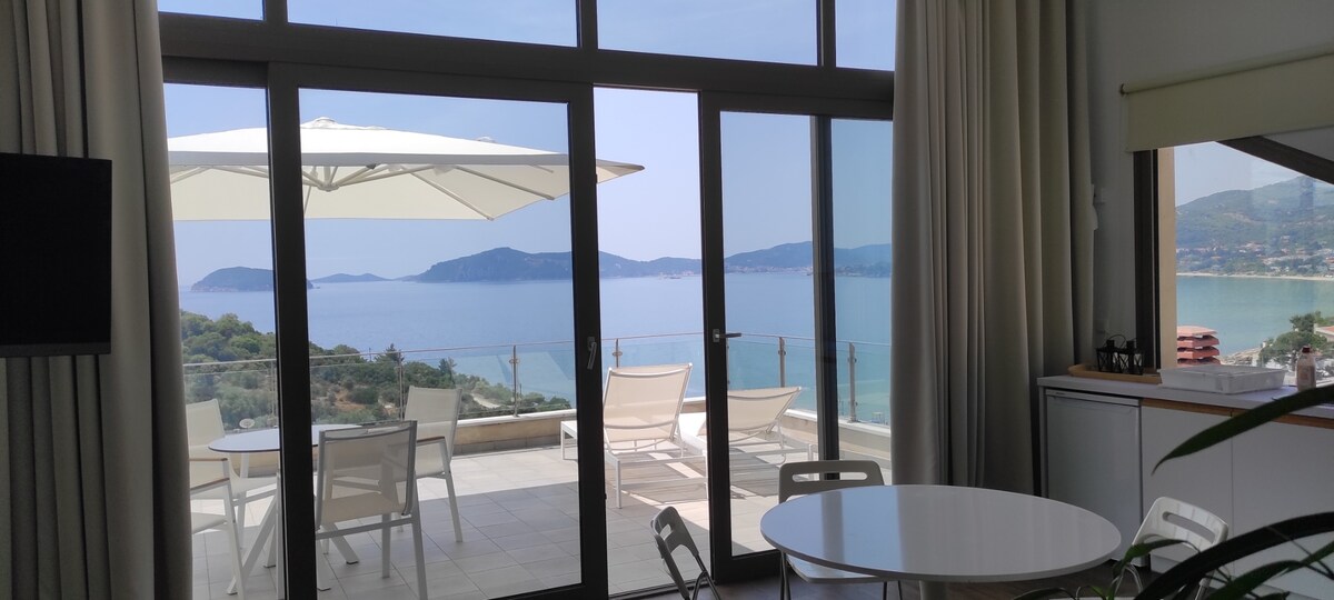 Embrace the beautiful ocean views in a great location, just a short walk away from the beach, local shops, bars and restaraunts of Sarti. This is a studio room with queen bed. Each apartment comes with a private balcony, bathroom/indoor shower and kitchenette. Extra bed available on reqeuest.