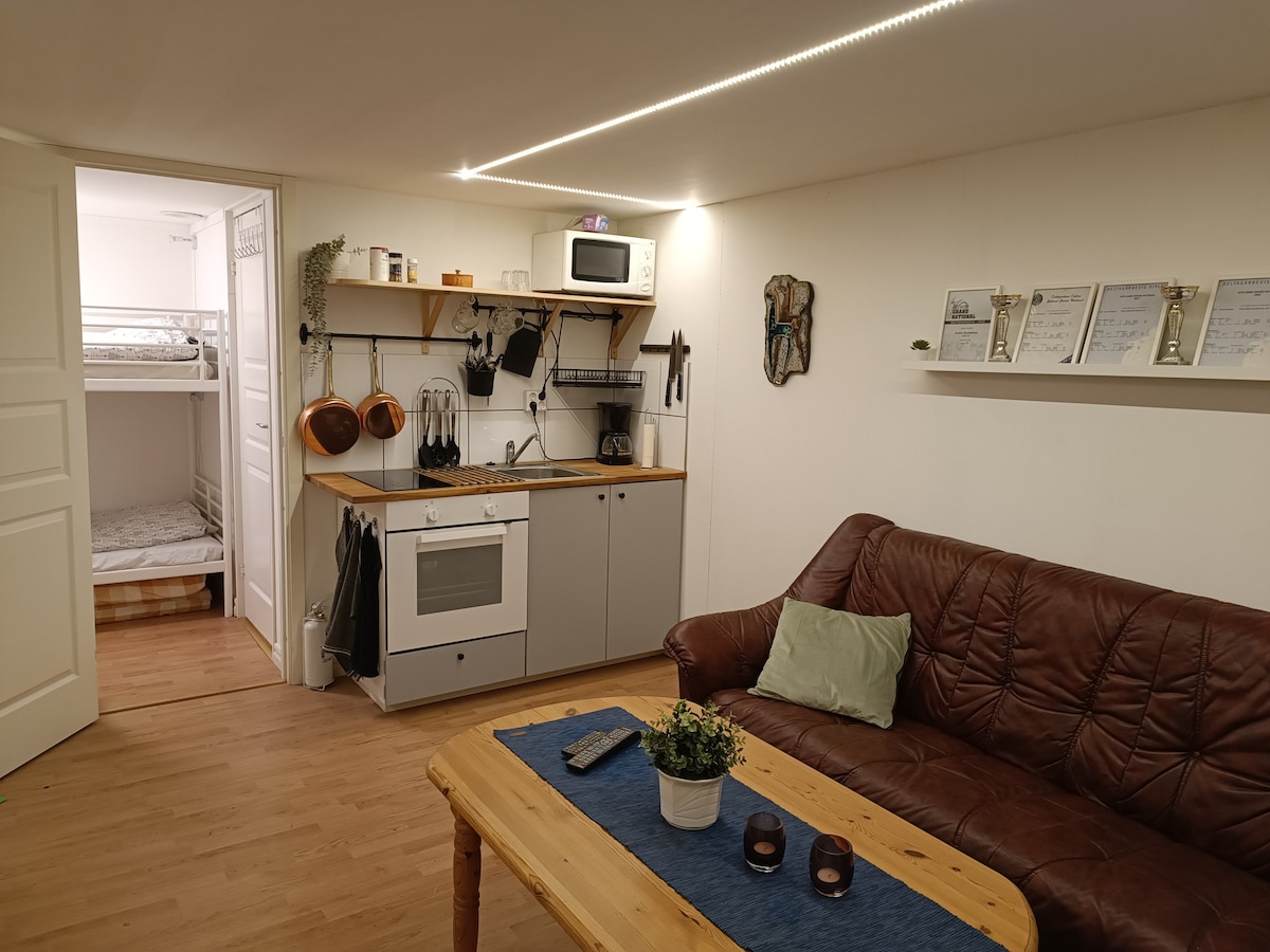Newly-renovated basement apartment in lower Haga – Quiet and safe location, with proximity to both nature and city life. Just a few minutes' walk to Hagaparken, grocery store, and central Umeå with shops, restaurants and culture. The train and bus station are also within walking distance. Suitable for 2-4 guests (double bed + sofa bed) Bed linens and towels are included. Perfect for couples or for small families. The apartment is part of our home – we welcome calm and well-behaved guests. No smoking and no pets allowed.